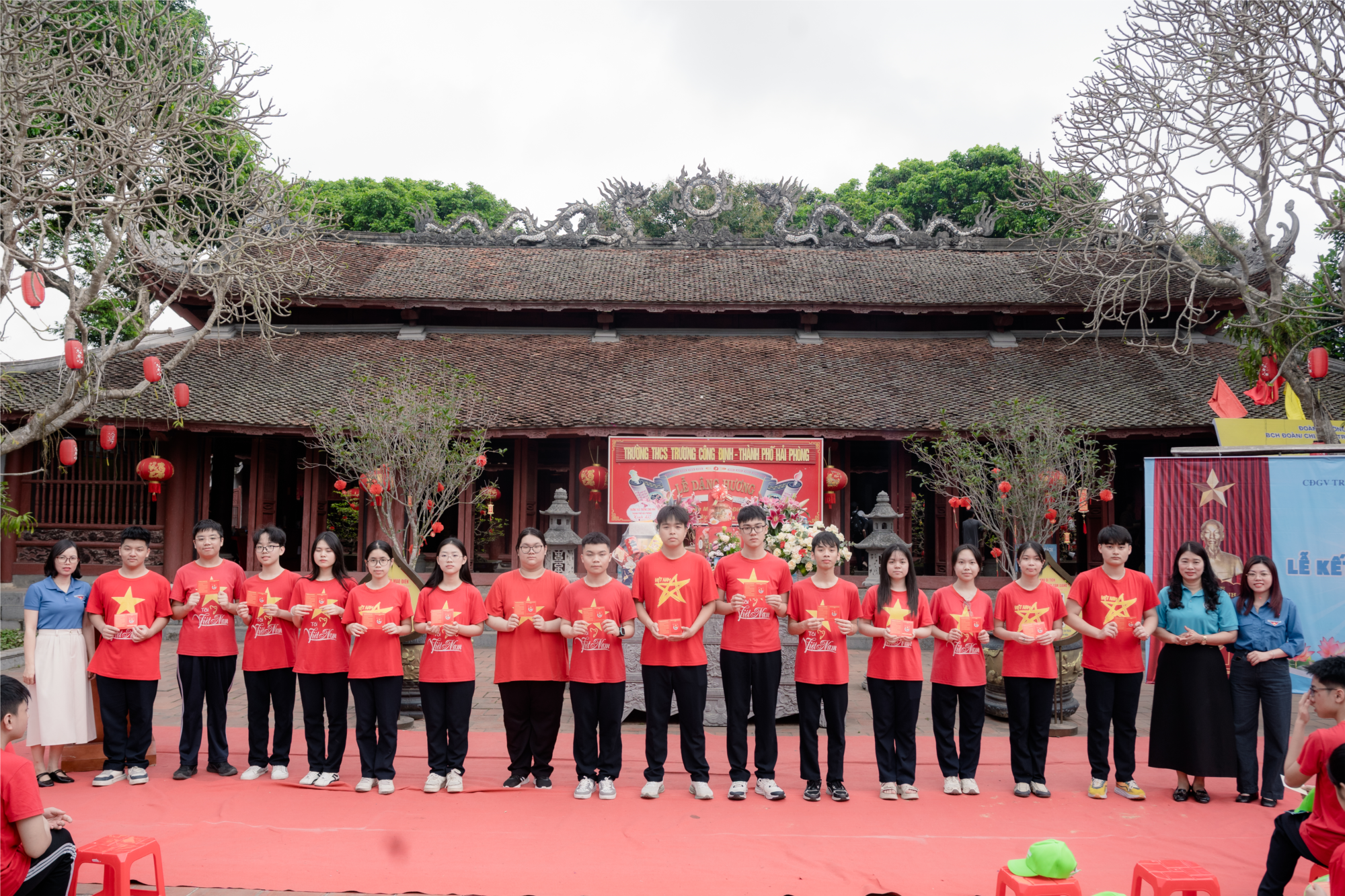Trong không khí thi đua sôi nổi Tháng Thanh niên, chào mừng kỷ niệm 95 năm ngày thành lập Đoàn TNCS Hồ Chí Minh (26/3/1931 - 26/3/2026), ngày 24/3, tại Văn miếu Mao Điền - di tích quốc gia đặc biệt thời Lê Sơ thờ Khổng Tử - ông tổ đạo Nho, cùng nhà giáo Chu Văn An và 8 vị đại khoa/danh nhân tiêu biểu của xứ Đông, Chi đoàn Trường THCS Trương Công Định trang trọng tổ chức Lễ kết nạp Đoàn viên mới cho 40 học sinh ưu tú, xuất sắc khối 9.