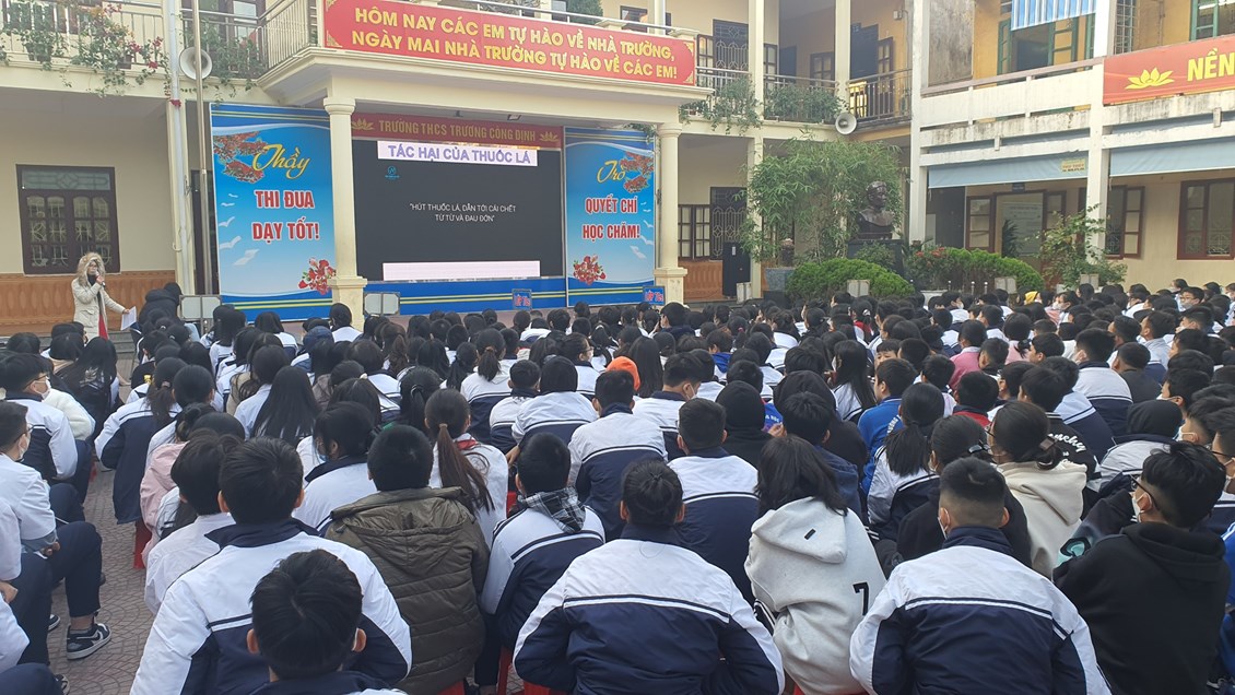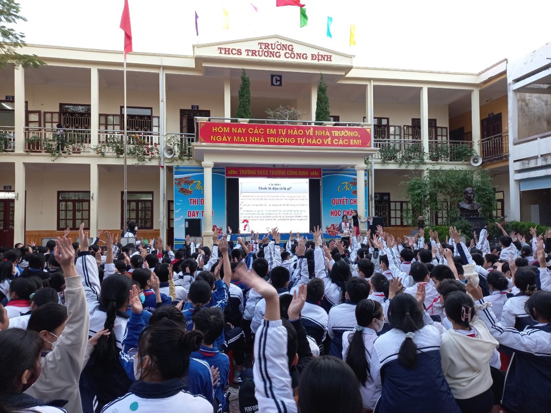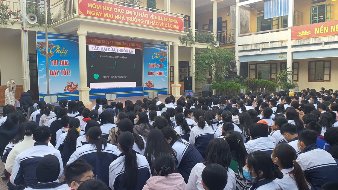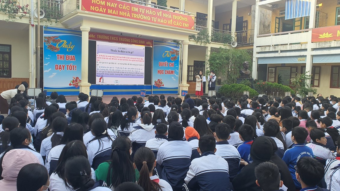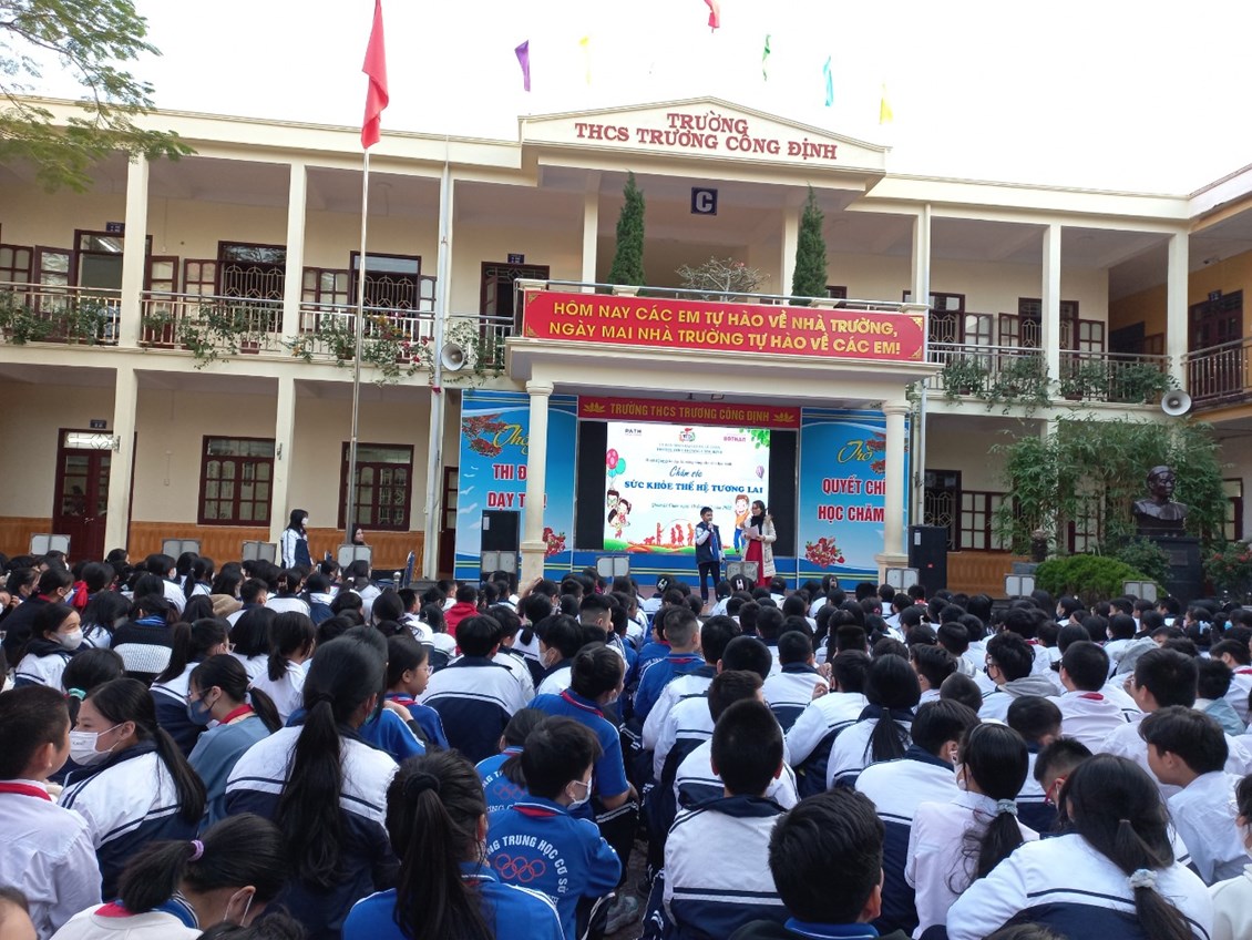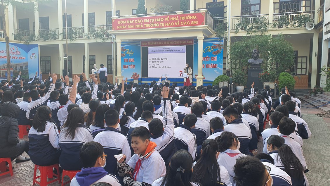 Với mục đích tuyên truyền và trang bị cho các em học sinh những kiến thức về các bệnh không lây nhiễm; tác hại của thuốc lá, rượu, bia; có chế độ dinh dưỡng hợp lí; có hiểu biết và chú ý về sức khỏe tâm thần, … ; được sự đồng ý của Ban giám hiệu nhà trường, thứ 2/19/12/2022, trường THCS Trương Công Định tổ chức hoạt động giáo dục kĩ năng sống cho các em học sinh với chủ đề “Chăm sóc sức khoẻ thế hệ tương lai”