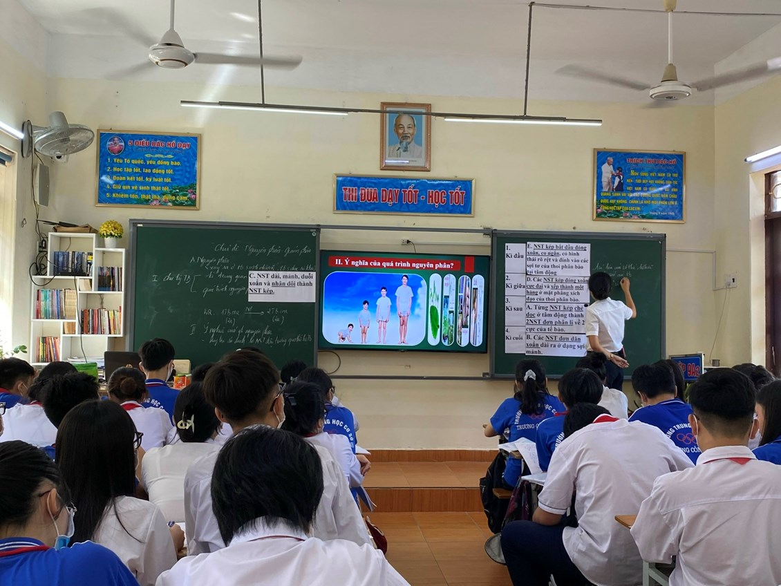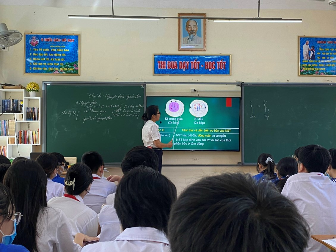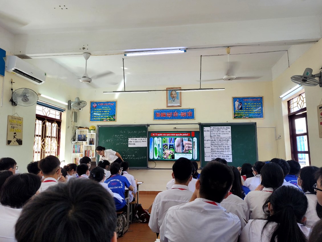 Nhằm tiếp tục nâng cao chất lượng giáo dục đại trà và tạo điều kiện cho các giáo viên trong tổ nhóm chuyên môn trau dồi, học hỏi kinh nghiệm, nâng cao trình độ chuyên môn, cô giáo Nguyễn Thị Nguyệt Vân đã lên lớp chuyên đề “Đổi mới phương pháp dạy học thông qua tiết dạy chủ đề “Nguyên phân – Giảm phân môn Sinh 9” với sự tham gia của các em học sinh lớp 9A2 trường THCS Trương Công Định.