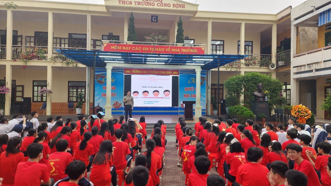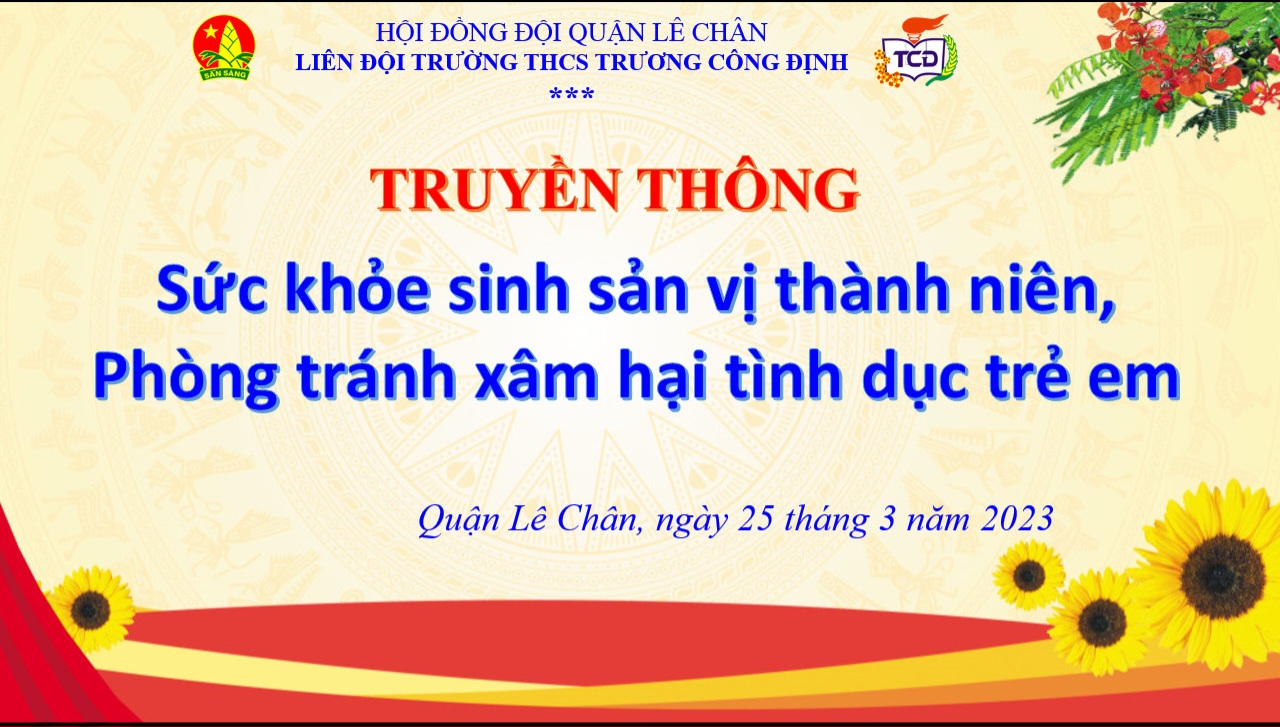 Thực hiện Kế hoạch năm học, được sự đồng ý của Ban giám hiệu nhà trường, sáng thứ 7/25/3/2023, Chi đoàn giáo viên, Liên đội trường THCS Trương Công Định đã tổ chức cho các em học sinh khối 8,9 tham dự buổi truyền thông với chủ đề “Sức khỏe sinh sản vị thành niên - Phòng tránh xâm hại tình dục trẻ em”.