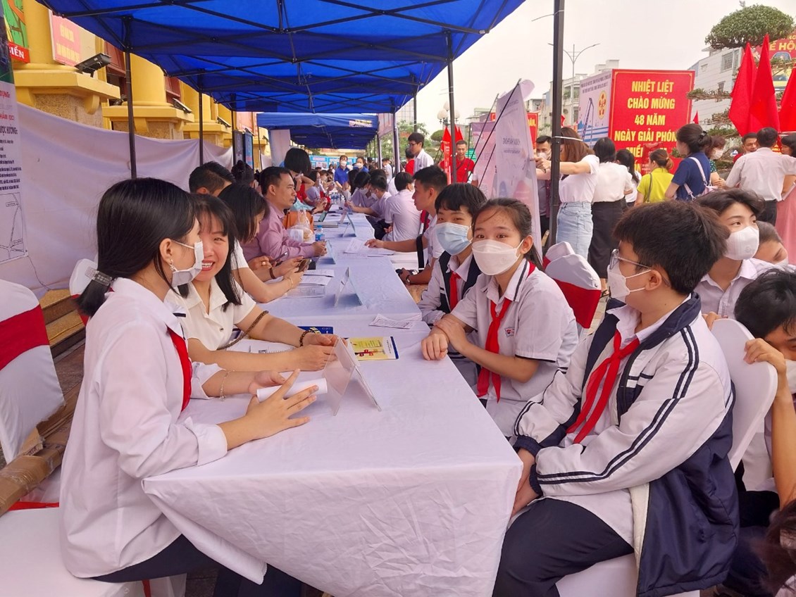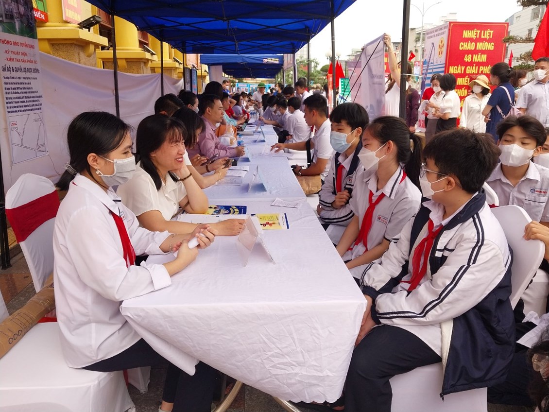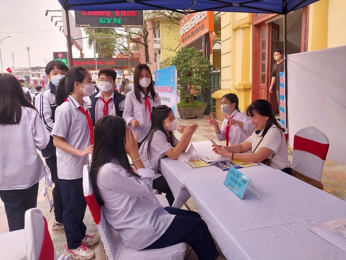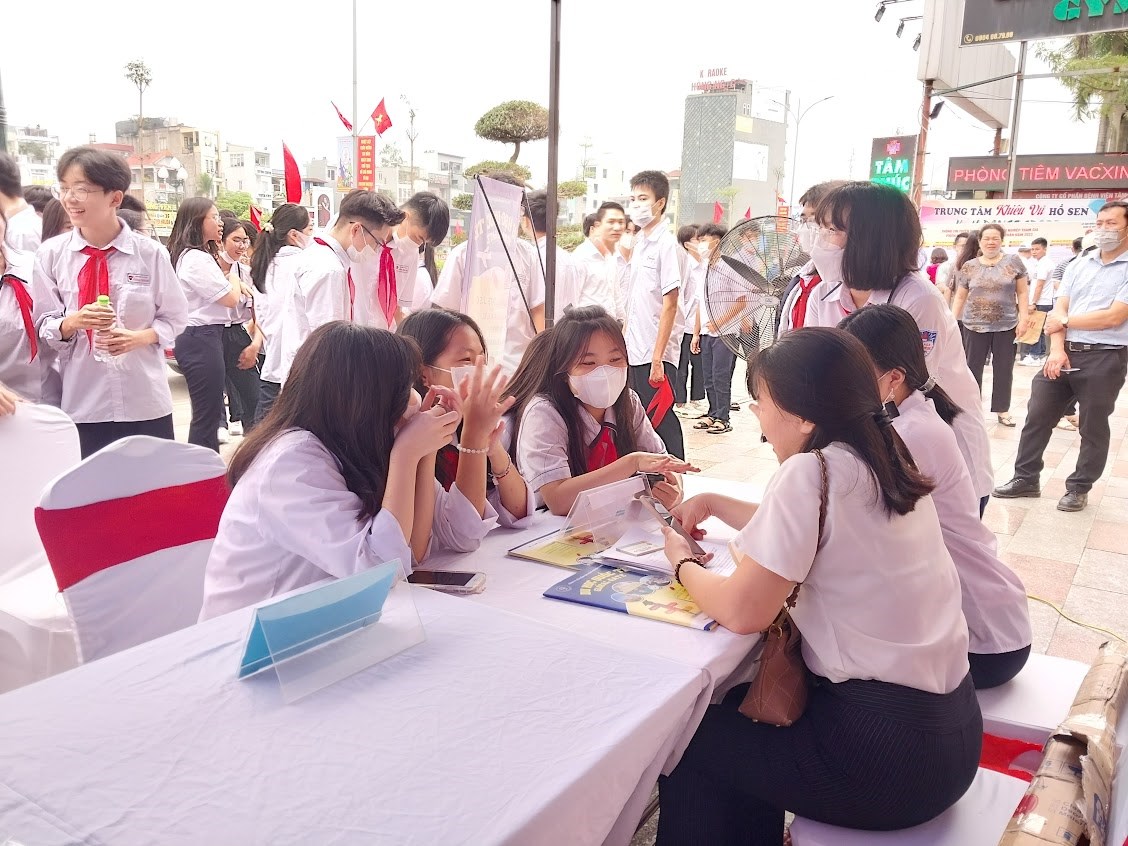 Tại đây các em được tham quan các gian hàng phiên giao dịch, được nghe tư vấn về các ngành nghề đang phát triển trong xã hội hiện nay.