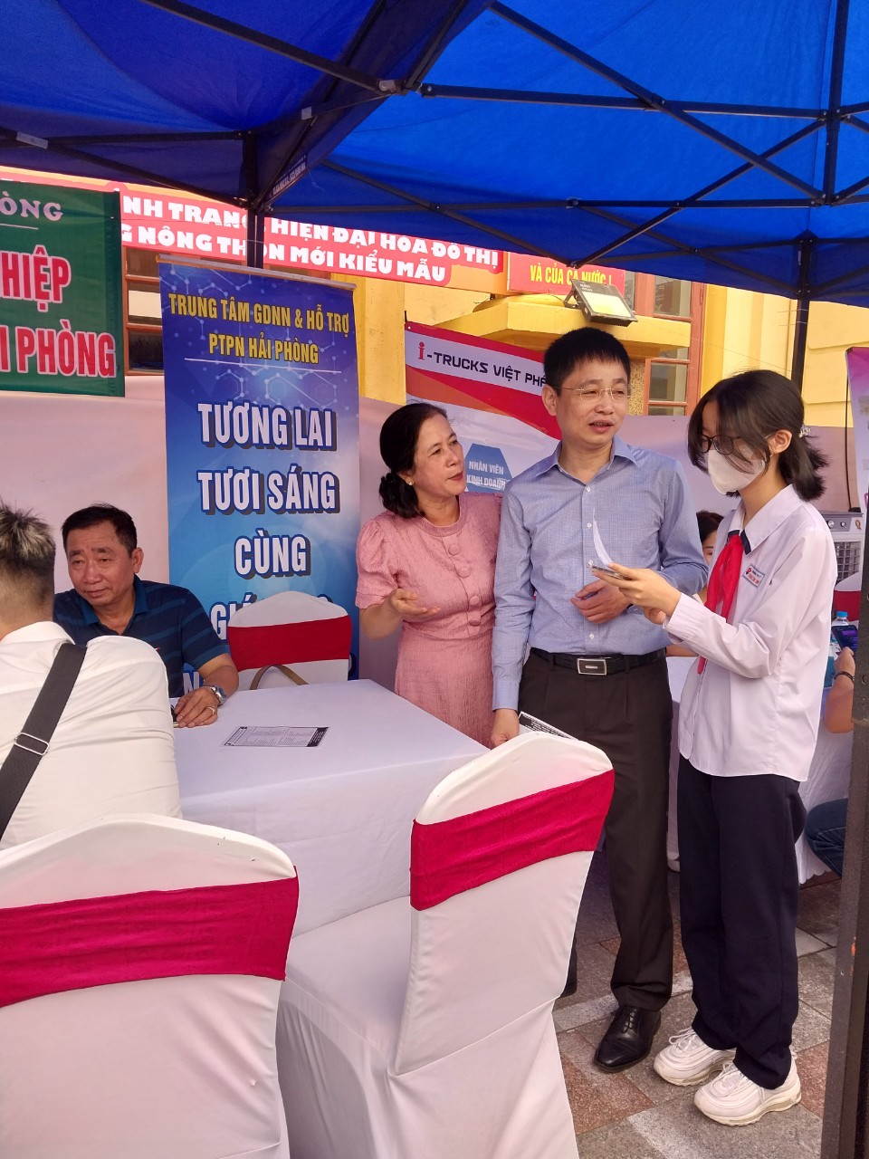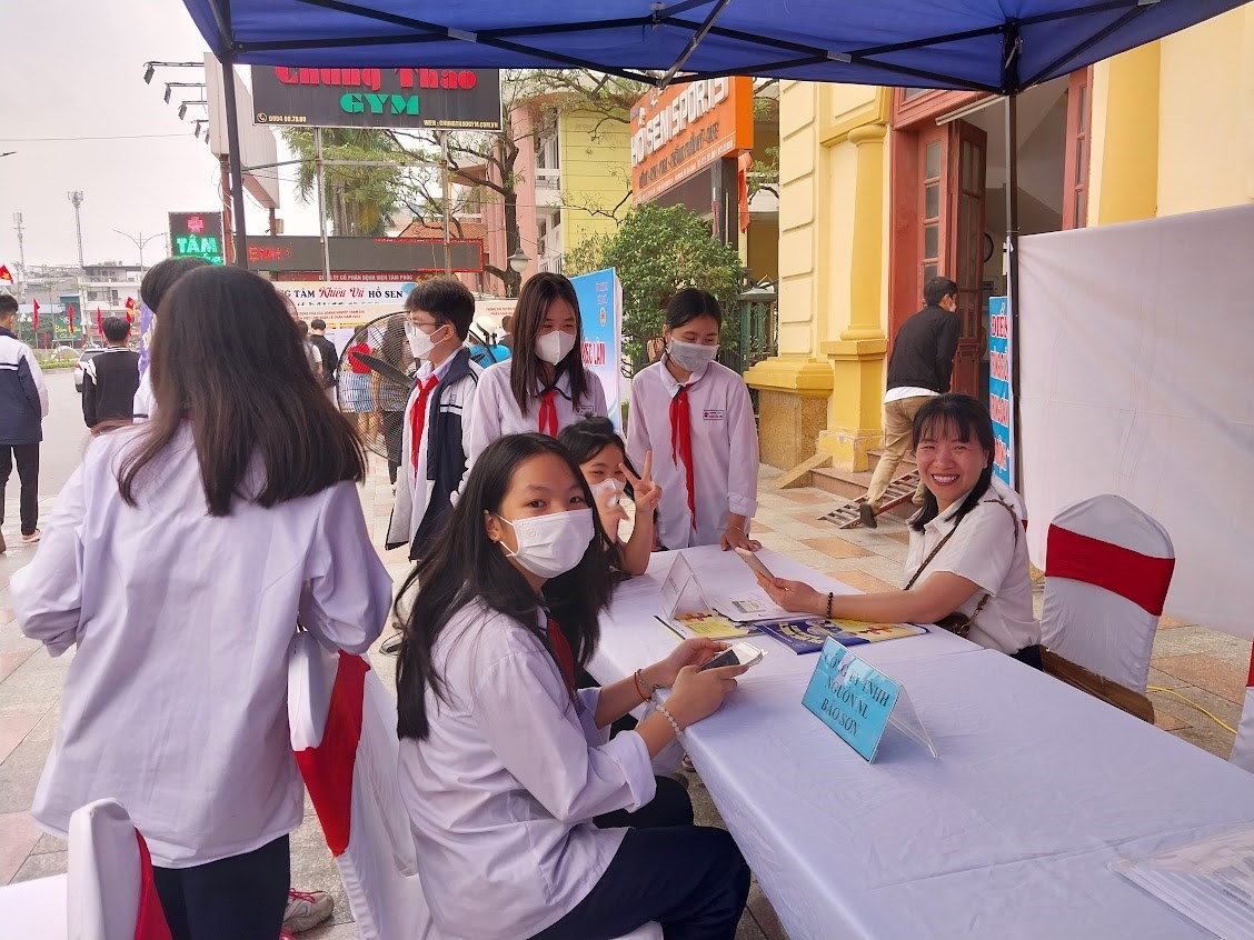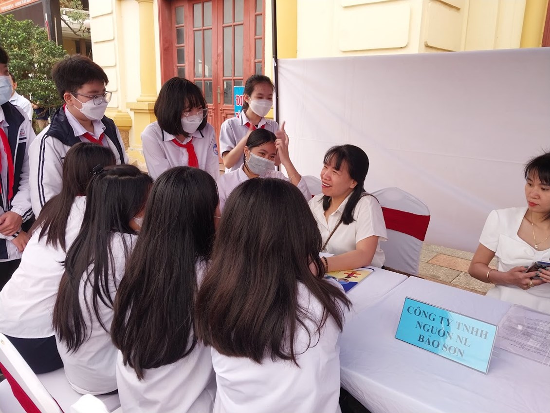Tại đây các em được tham quan các gian hàng phiên giao dịch, được nghe tư vấn về các ngành nghề đang phát triển trong xã hội hiện nay.