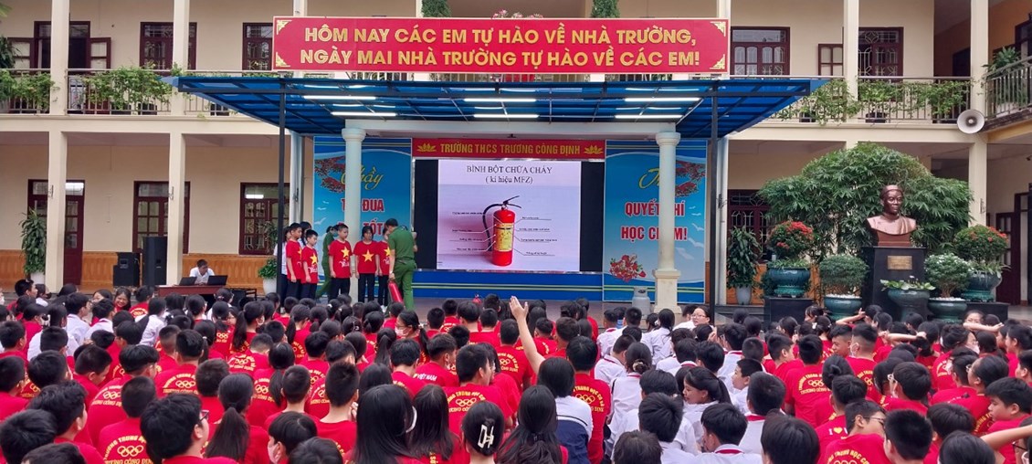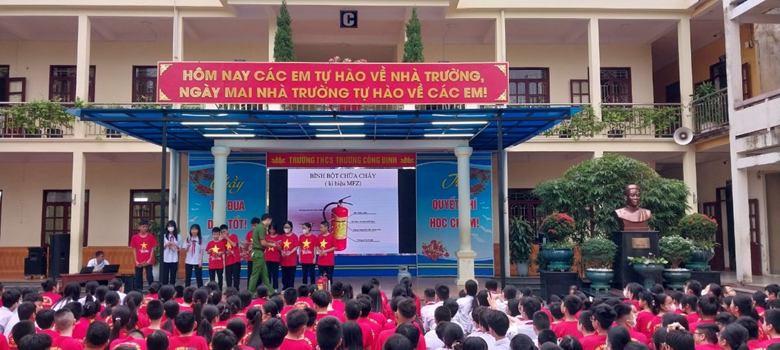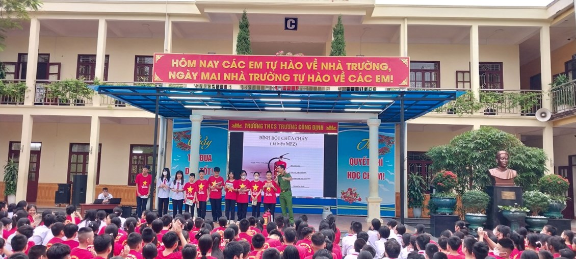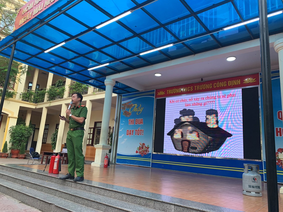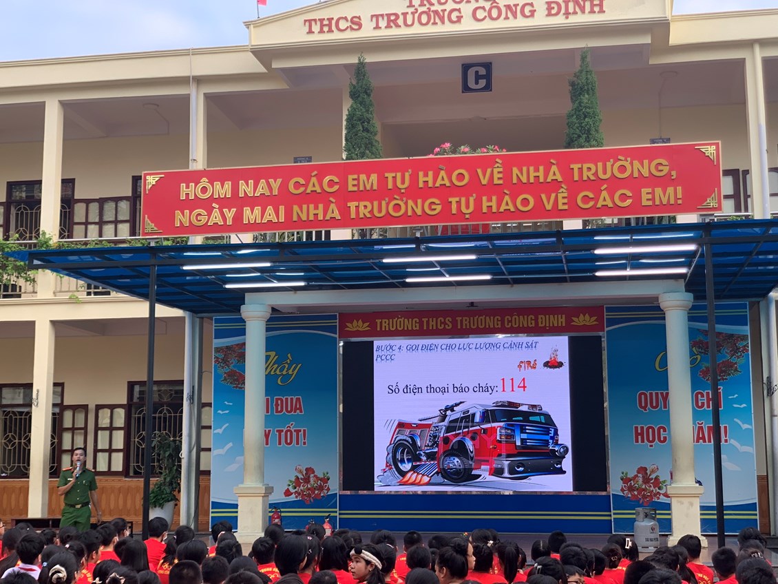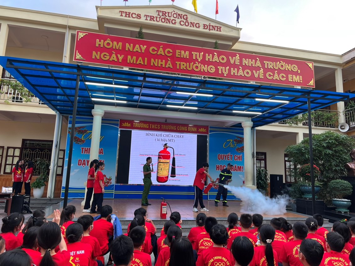 Thực hiện Kế hoạch phòng cháy chữa cháy năm học 2023 - 2024, thứ Hai ngày 23/10/2023 trường THCS Trương Công Định tổ chức hoạt động Tuyên truyền kiến thức pháp luật về PCCC – Kỹ năng chữa cháy và thoát nạn khi có cháy cho các em học sinh toàn trường.