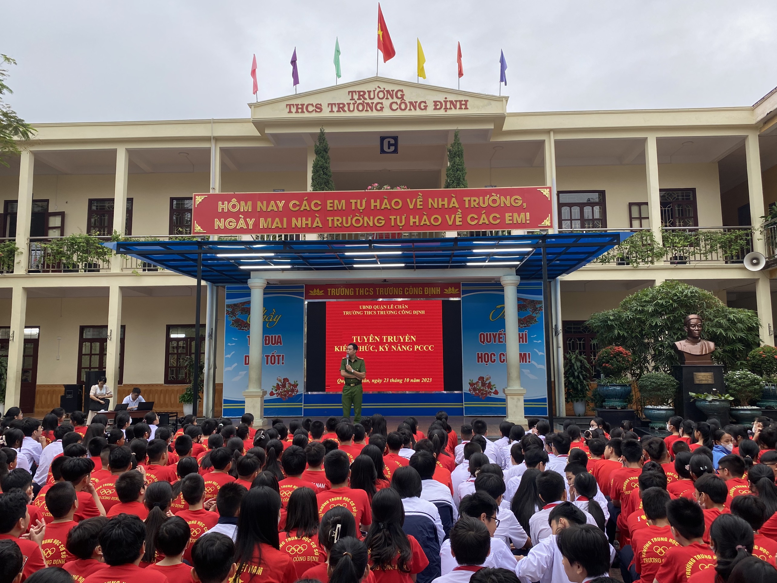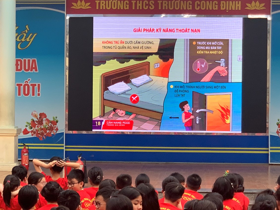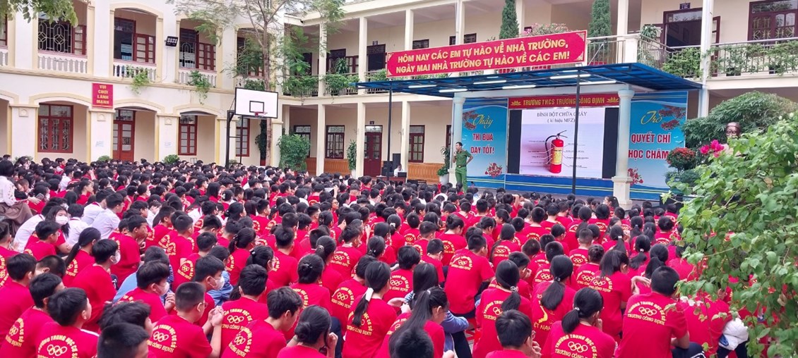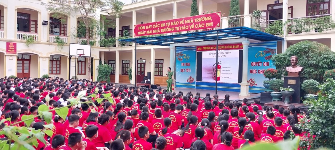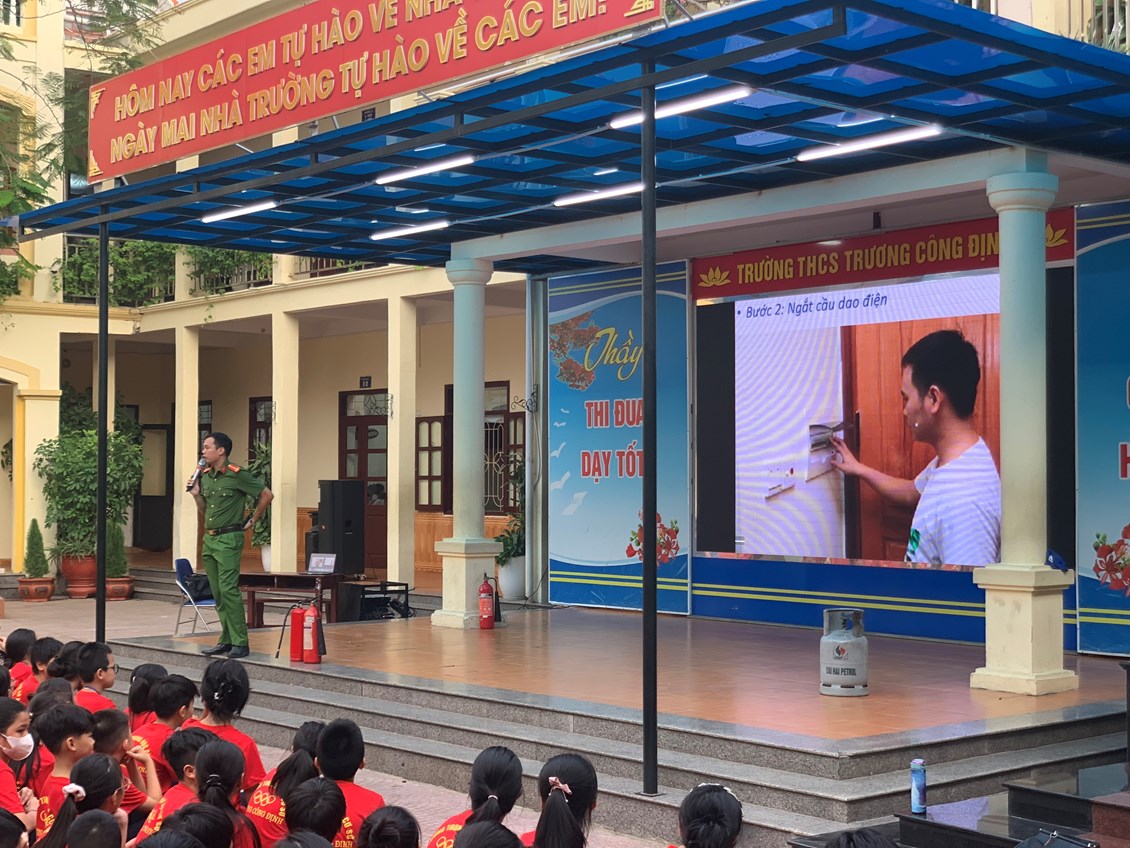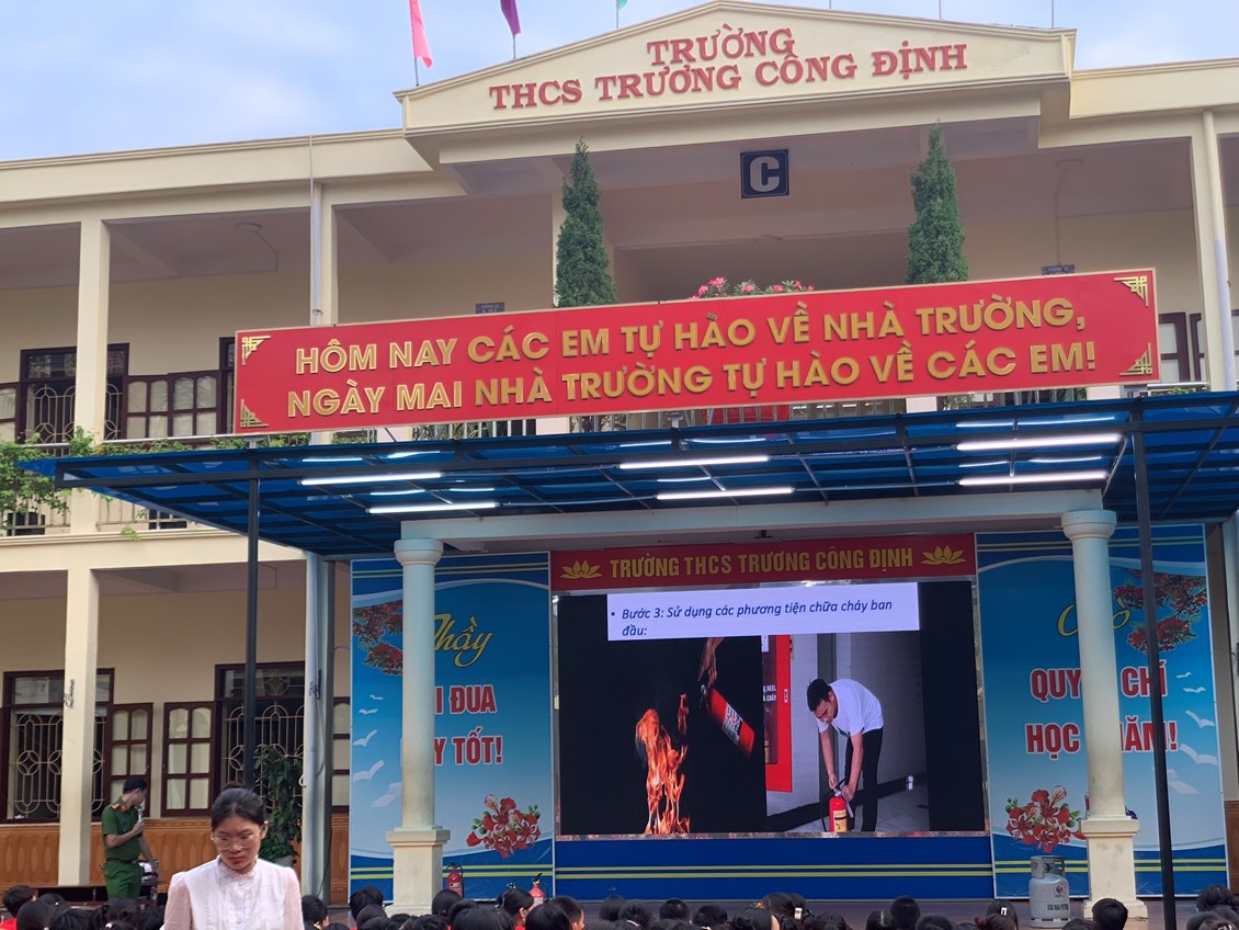 Thực hiện Kế hoạch phòng cháy chữa cháy năm học 2023 - 2024, thứ Hai ngày 23/10/2023 trường THCS Trương Công Định tổ chức hoạt động Tuyên truyền kiến thức pháp luật về PCCC – Kỹ năng chữa cháy và thoát nạn khi có cháy cho các em học sinh toàn trường.