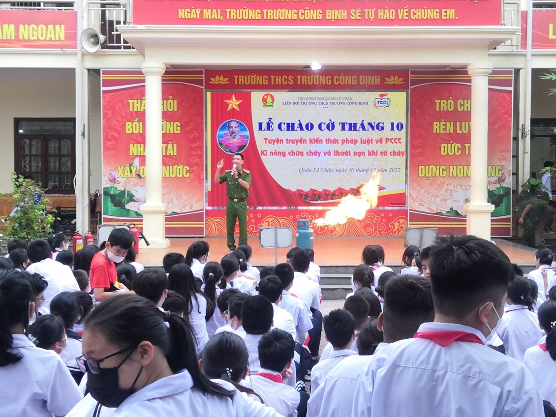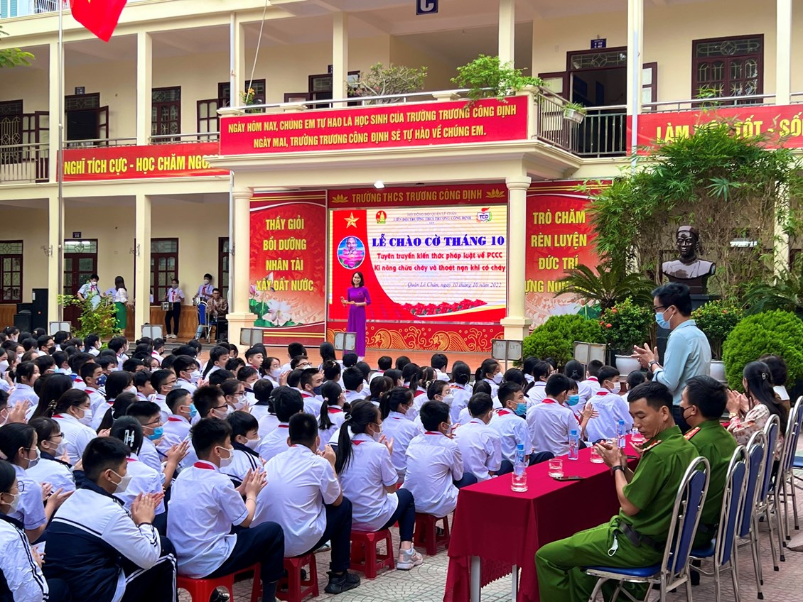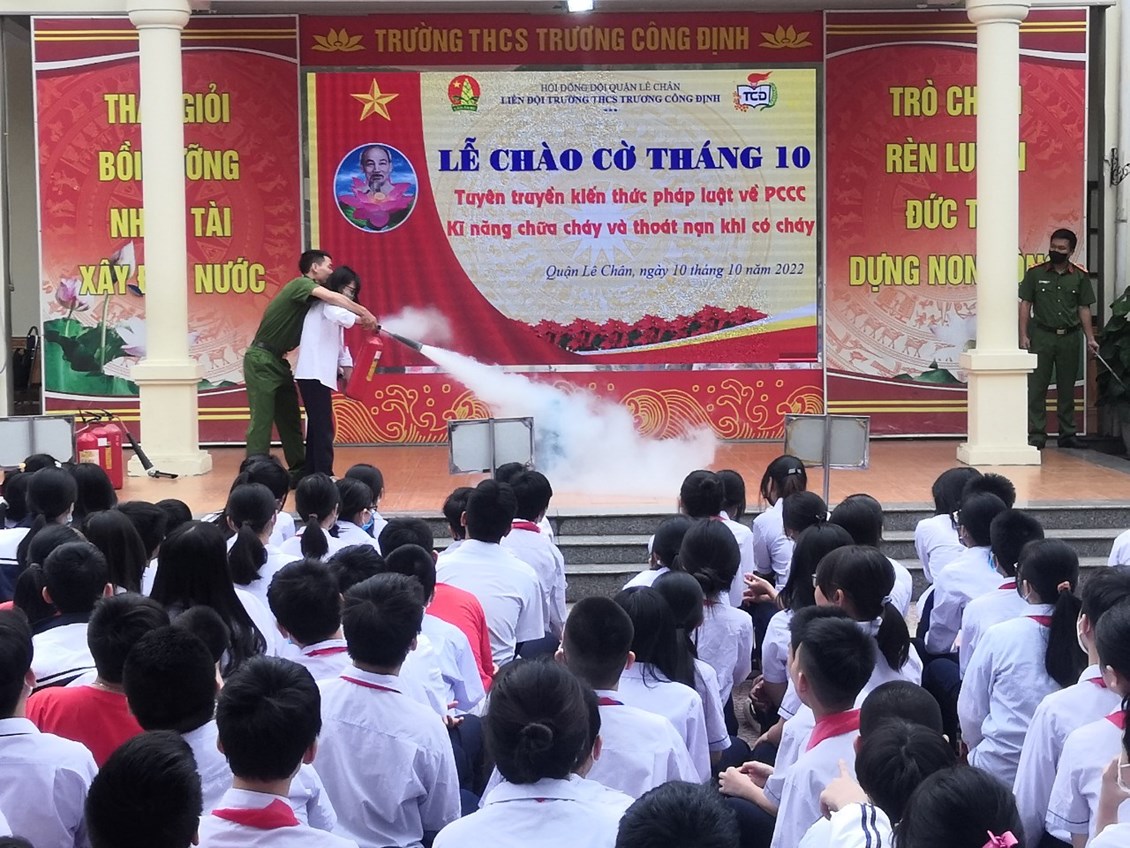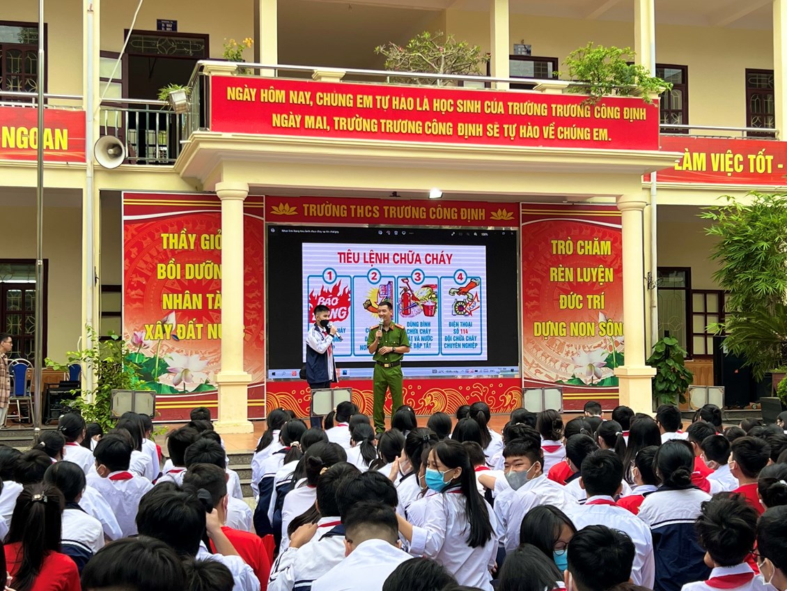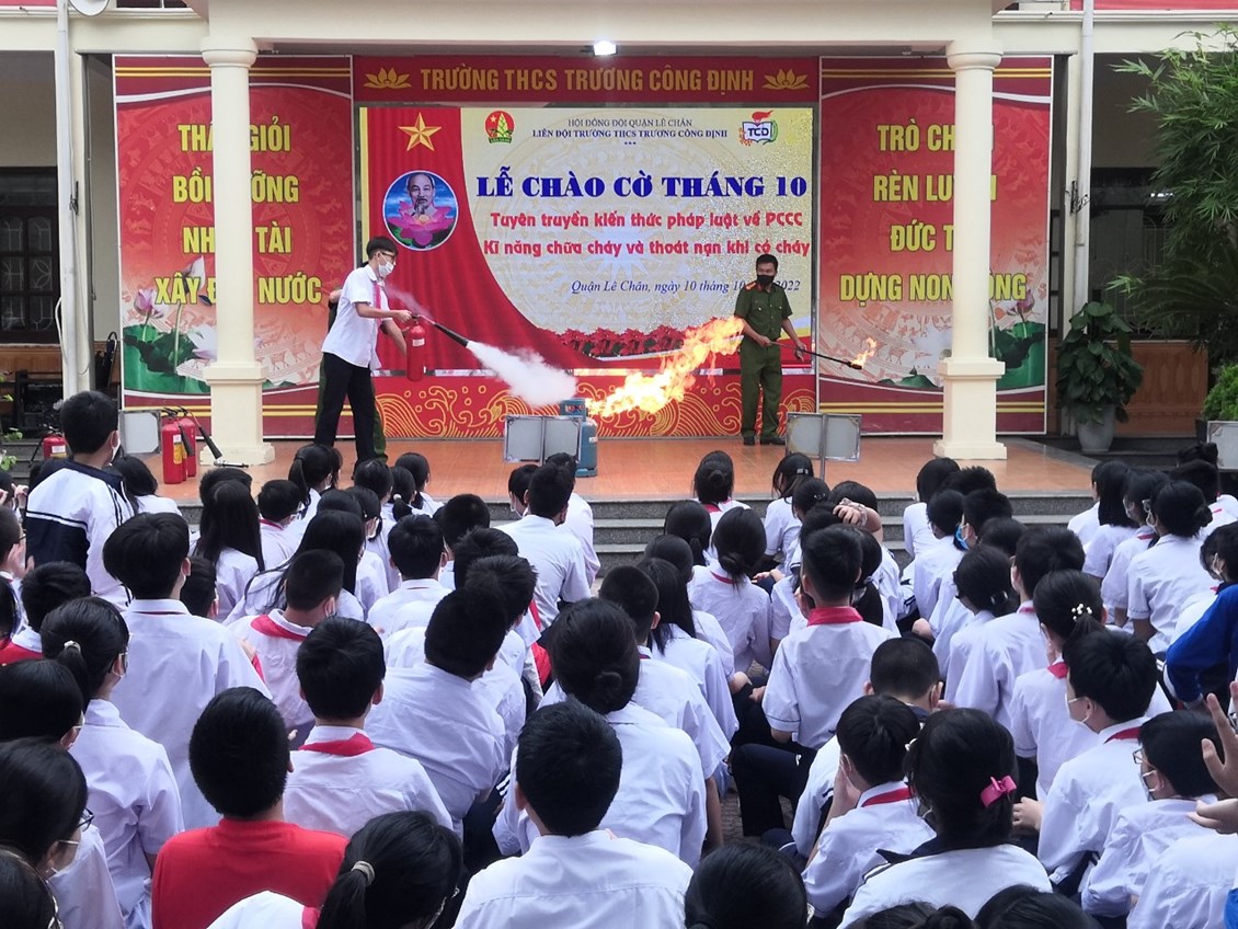 Hôm nay, thứ Hai ngày 10 tháng 10 năm 2022, trường THCS Trương Công Định tổ chức hoạt động Tuyên truyền kiến thức pháp luật về PCCC – Kỹ năng chữa cháy và thoát nạn khi có cháy cho các em học sinh.