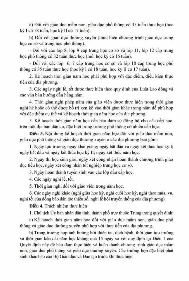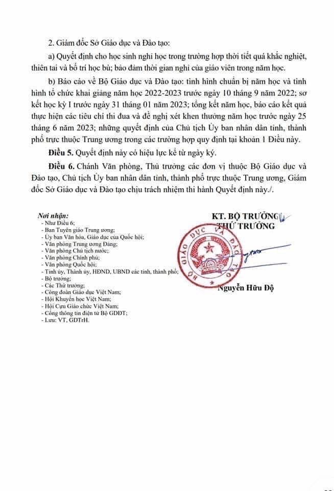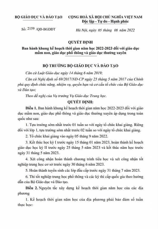 Quyết định ban hành khung kế hoạch thời gian năm học 2022-2023 đối với GD Mầm non, GD Phổ thông và GD thường xuyên áp dụng trong toàn quốc của Bộ GD&ĐT.